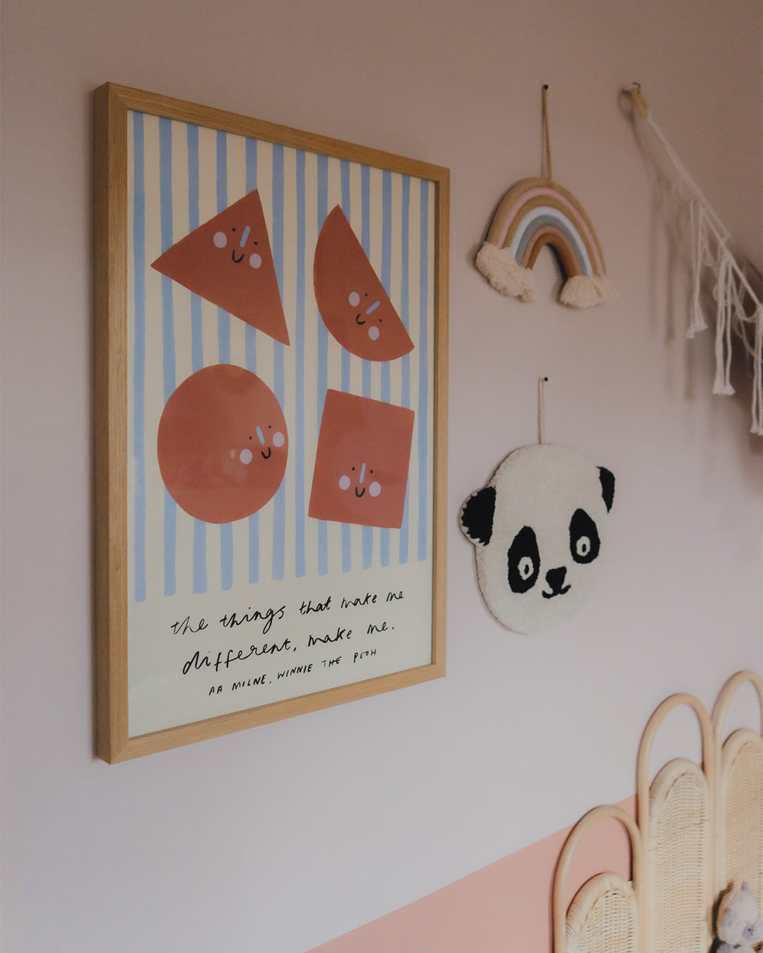 Oh-so-wise A.A. Milne reminds us: ‘The things that make me different, make me.’ With playful shapes and cheerful faces, this print reassures children that being different is something to be celebrated. Whether displayed in a playroom, nursery, or classroom, it’s a vibrant reminder that difference is what makes us truly special.